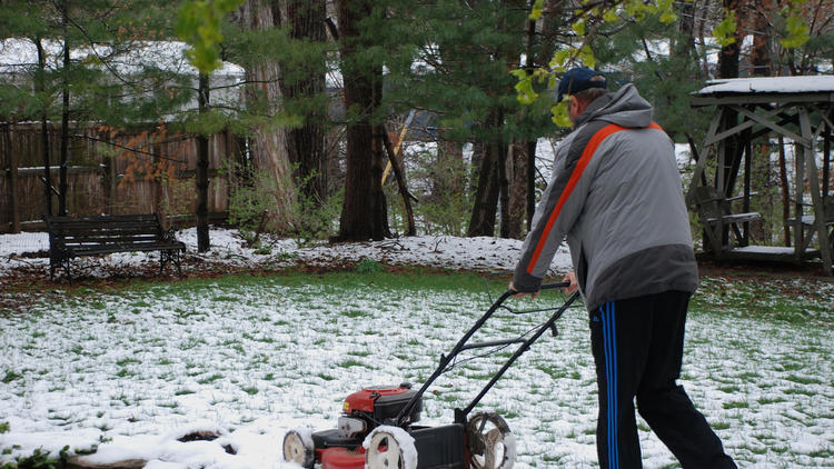 Flakes of the white stuff were falling on both of us. “So, I should push the mower right through the snow?” I asked.