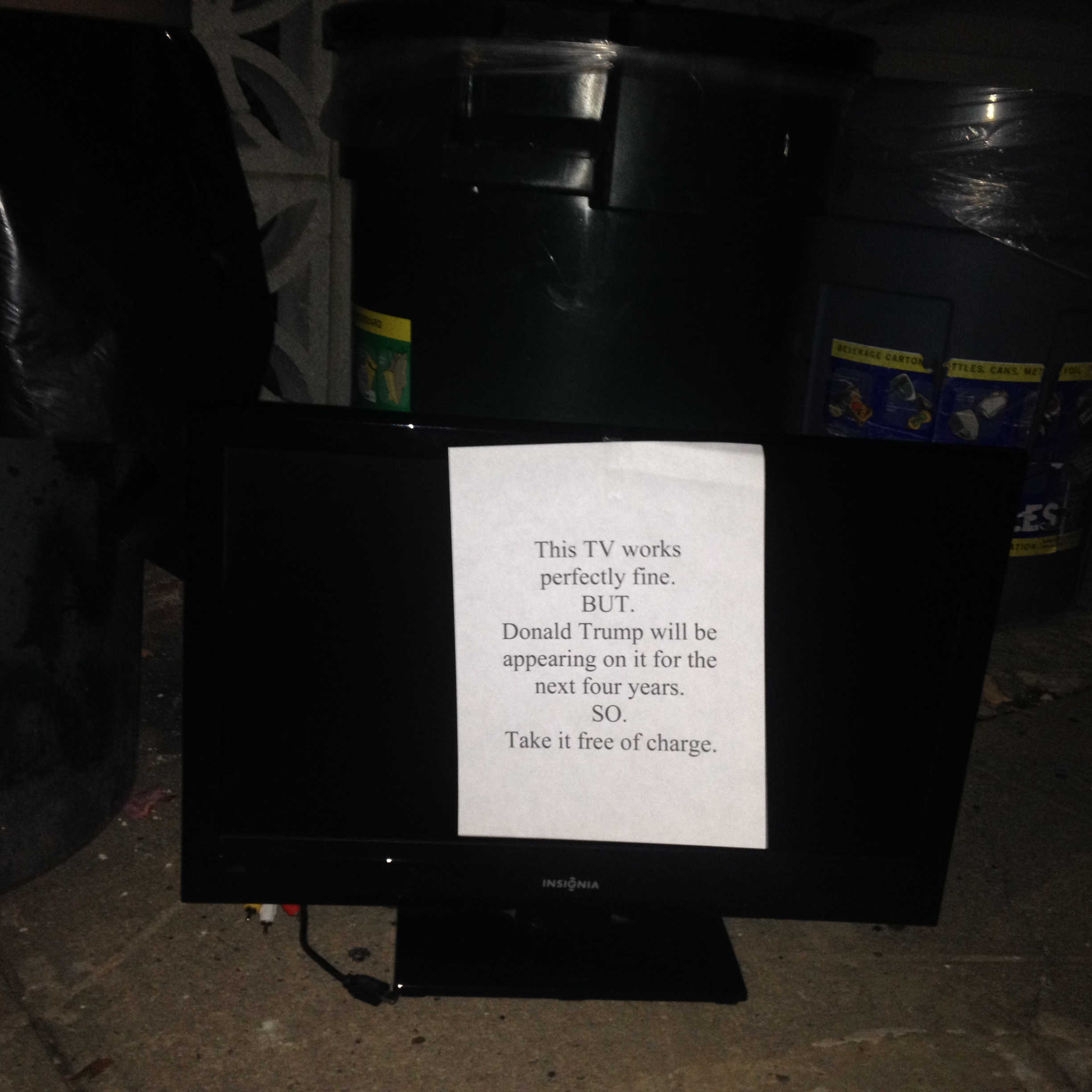 Alongside the TV-turned-garbage artifact, Ryan placed a hand-written sign: “This TV works perfectly fine but Donald Trump will be appearing on it for the next four years so take it free of charge.”